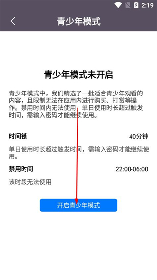 4、在青少年模式页面,点击开启青少年模式按钮,即可启用该模式。