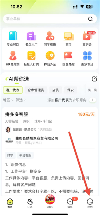 1、在求职app界面,点击我的选项,进入个人相关操作页面。