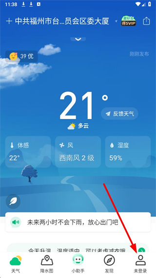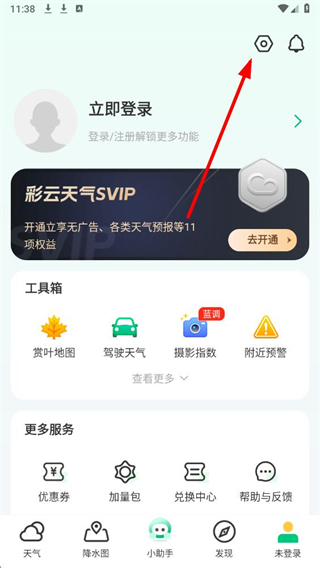 1、在彩云天气app界面底部,点击未登录选项进入个人相关页面。