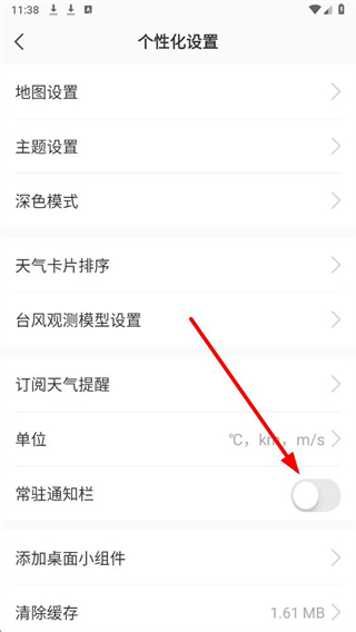 3、在个性化设置页面,找到常驻通知栏选项,将其对应的开关开启,即可使彩云天气app常驻通知栏。