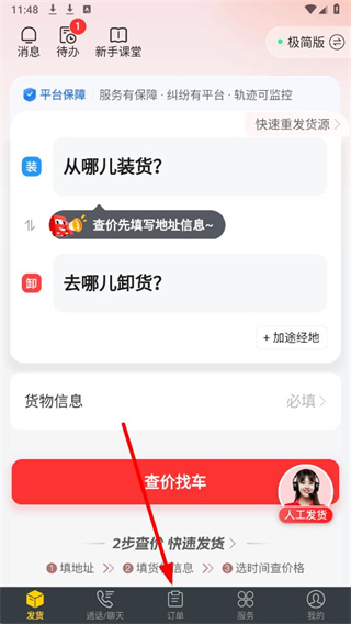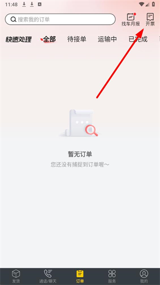 1、打开货车帮货主app,在发货页面点击底部的订单选项,进入订单页面。