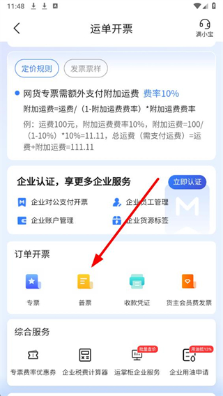 3、在运单开票页面,点击普票选项,进入普票服务页面后。