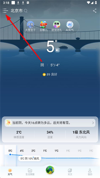 1、在最美天气应用界面左上角,点击菜单按钮,进入功能页面。