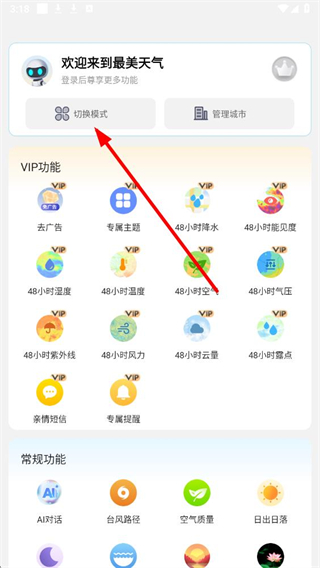 2、进入页面后,找到切换模式按钮并点击,进入天气模式的选择界面。