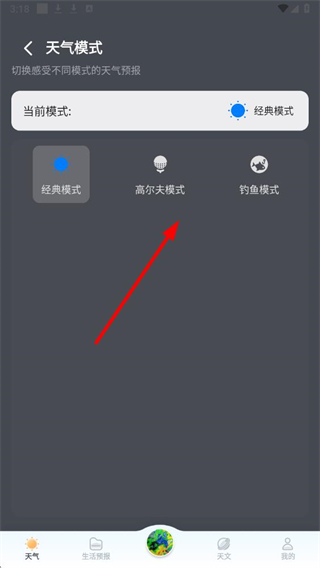 3、在天气模式页面,可选择经典模式、高尔夫模式、钓鱼模式等,点击对应模式即可完成切换。