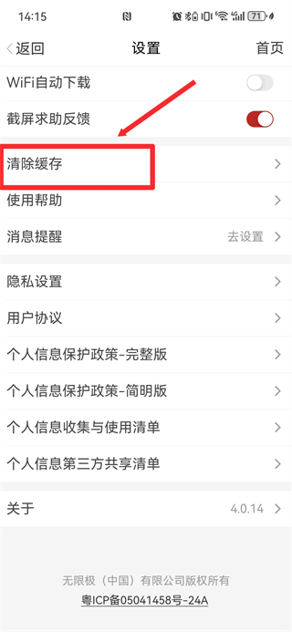 3、进入设置页面后,选择清除缓存选项来触发缓存清理操作。