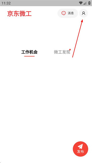 2、进入京东微工主界面,找到右上角的个人相关图标,点击该图标进入对应的页面。