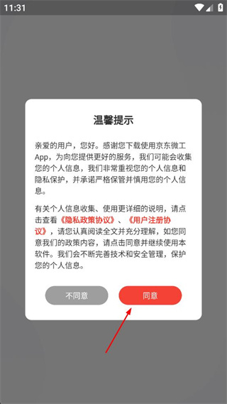 1、打开京东微工App后,阅读弹出的温馨提示内容,确认后点击界面中的同意按钮。