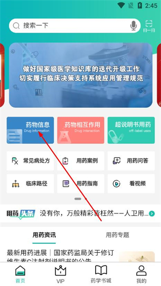 1、打开人卫用药助手app首页,点击药物信息,进入药物分类页面。