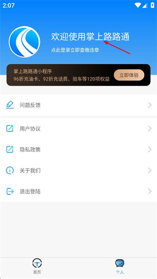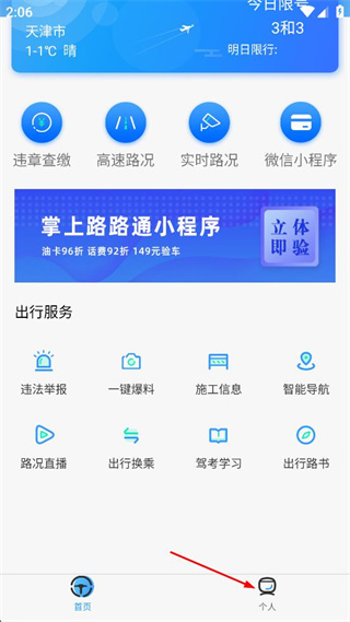 2、进入掌上路路通主界面,找到页面底部的个人选项,点击该选项进入对应页面。