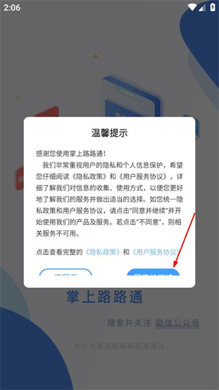 1、打开掌上路路通,查看弹出的温馨提示内容,点击界面中的同意按钮以继续使用。