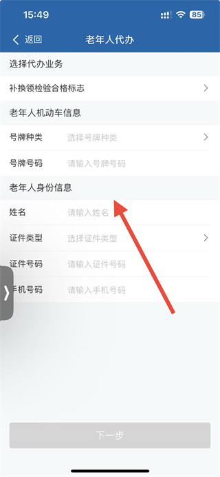 4、填写老年人机动车号牌种类、号码及身份-姓名、证件号、手机号,提交申请完成检验合格证申领。