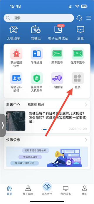 1、打开交管12123APP,在首页点击更多进入业务中心。