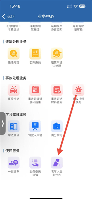 2、在业务中心便民服务区,点击老年人业务代办,进入代办业务选择界面,准备选定目标业务。