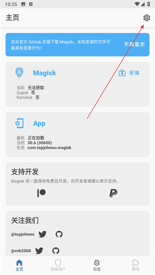 1、打开Magisk进入主页界面,点击页面右上角的设置图标进入设置操作页面。
