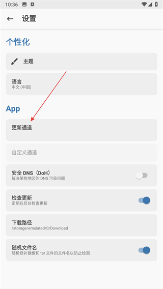 3、进入设置页面,在个性化板块,可设置主题和语言,在App板块,能选择更新通道,设置安全DNS(DoH),检查更新,下载路径,随机文件名等,根据需求进行各项设置。