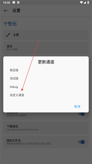 3、在更新通道选择菜单里点击自定义通道选项,进入自定义通道的设置界面。