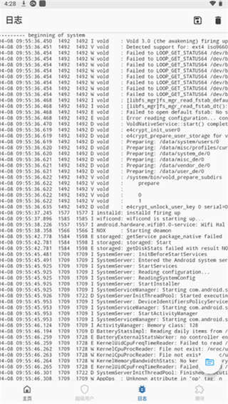 2、切换到日志页面,可查看详细的日志内容,了解软件运行等相关信息,页面底部有主页,超级用户,日志,模块等选项,可在不同页面间切换。
