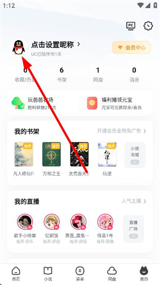 1、打开UC浏览器APP,进入我的页面后,点击左上角头像或点击设置昵称区域,进入个人信息界面。