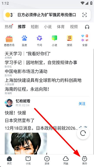 1、打开UC浏览器,点击页面底部导航栏的我的选项。