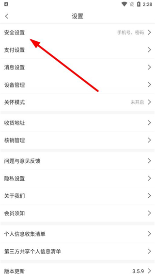 2、在设置页面,选择安全设置选项,进入对应页面。