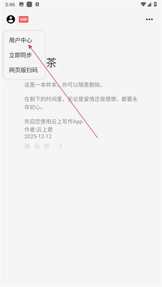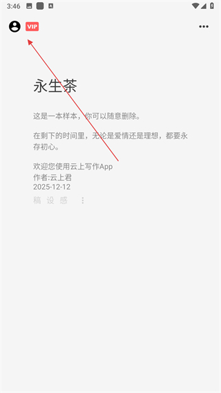 1、打开云上写作应用,点击界面左上角带VIP标识的头像图标,展开功能选项列表。