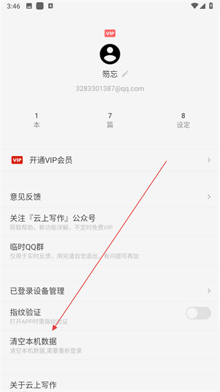3、在用户中心页面中,向下滑动找到清空本机数据选项,点击触发确认提示弹窗。