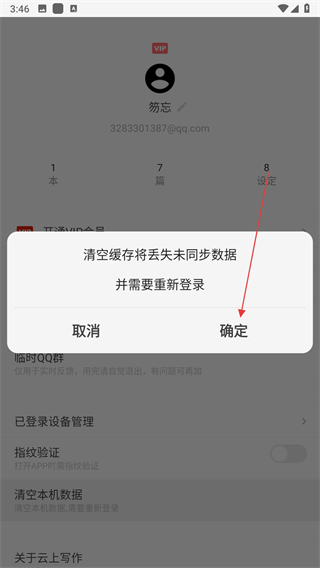 4、在弹出的清空缓存将丢失未同步数据并需要重新登录提示框中,点击确定按钮。