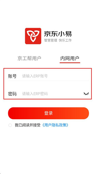3、在内网用户登录区域的输入框内,分别填写对应的ERP账号以及ERP密码信息。