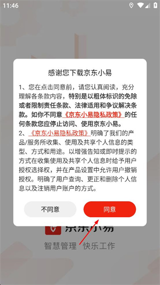 1、打开京东小易后,阅读弹出的隐私政策相关提示内容,确认后点击界面中的同意按钮。
