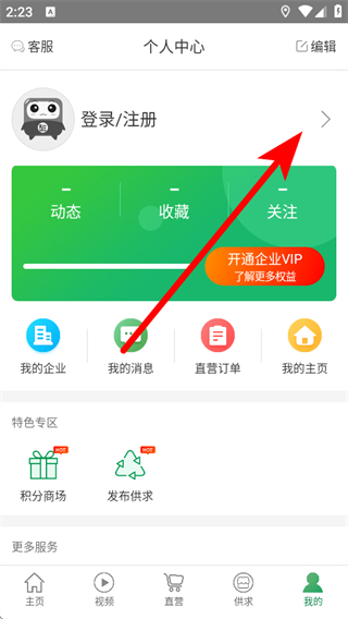 2、在个人中心点击登录/注册,进入账号登录注册选择界面。