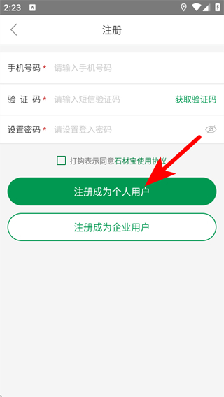 4、填手机号、验证码、密码并勾选协议,点注册成为个人用户完成注册。