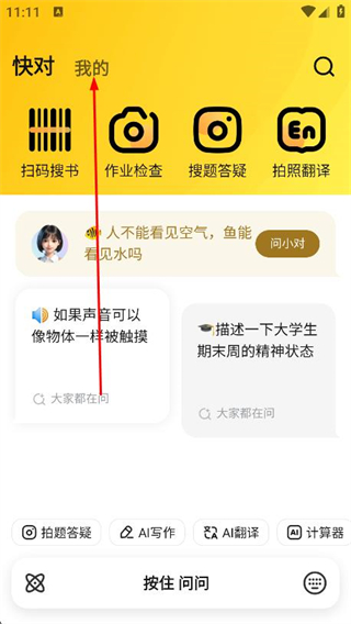 1、打开快对作业APP,点击页面顶部的我的选项,进入个人中心页面。