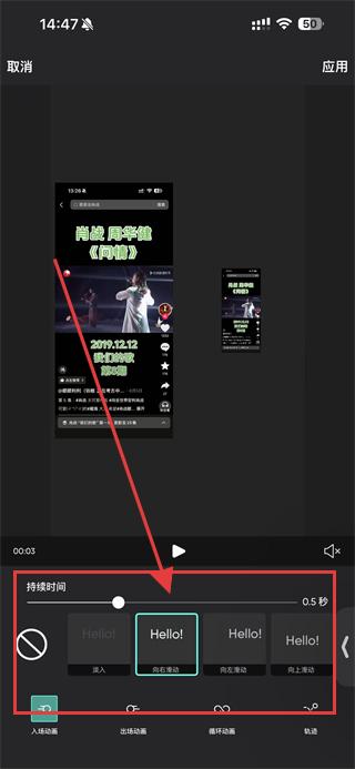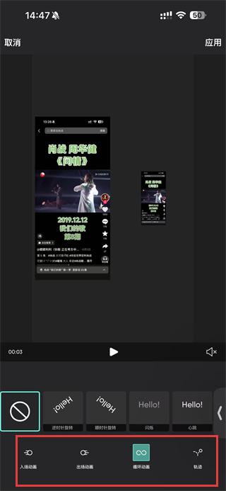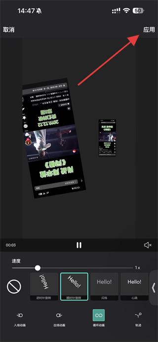 4、确认动画特效的设置效果后,点击页面右上角的应用按钮,即可将该动画效果应用到视频中。