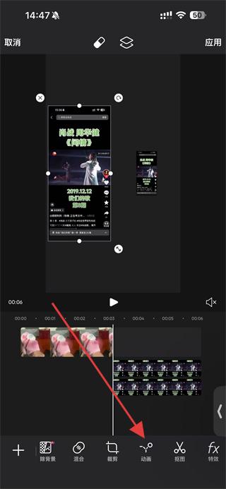 1、在Picsart的视频编辑界面,点击底部功能栏中的动画选项,打开动画相关的设置面板。