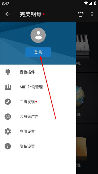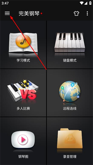 1、打开完美钢琴APP,点击页面左上角的按钮。