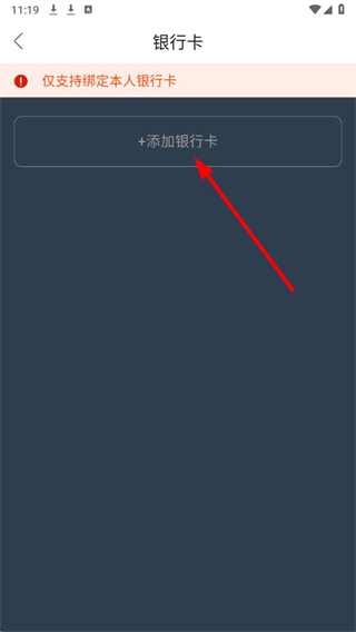 4、在银行卡页面,点击添加银行卡按钮,按提示操作即可绑定本人银行卡,注意仅支持绑定本人卡。