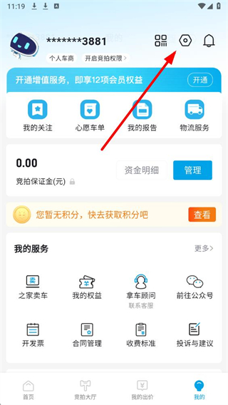 2、在我的页面右上角,找到设置图标并点击,进入设置界面。