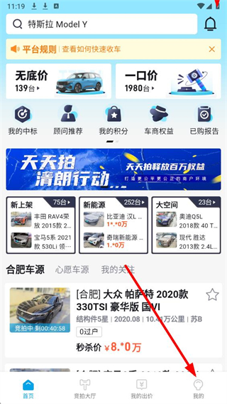 1、在天天拍车主界面,点击底部我的,进入个人功能页。