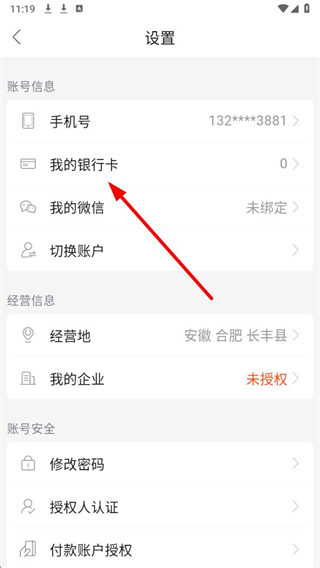3、在设置页面的账号信息板块中,选择我的银行卡选项,进入银行卡管理相关页面。