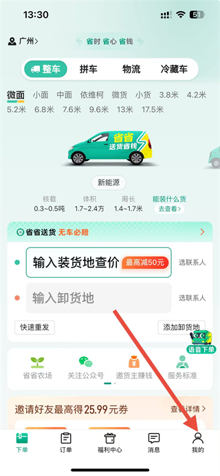 1、打开省省回头车app,在页面点击底部我的选项,进入个人页面。