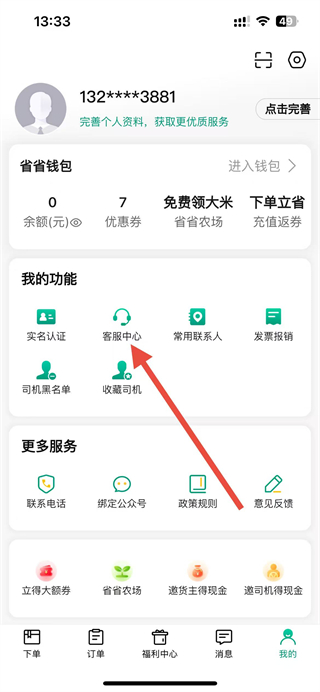 2、进入个人页面后,在我的功能区域,找到并点击客服中心选项,进入客服中心页面。
