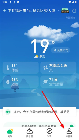1、进入天气展示界面,点击底部右侧的未登录选项,进入个人相关功能页面。