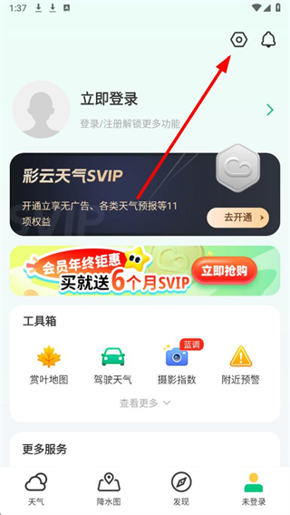 1、在彩云天气主界面,点击底部导航栏的未登录选项,进入个人相关页面。
