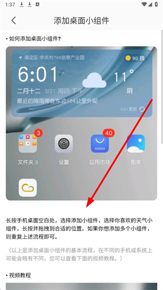 4、按照页面提示,长按手机桌面空白处,选择添加小组件,拖拽到合适位置,即可完成添加。