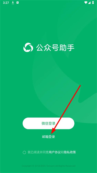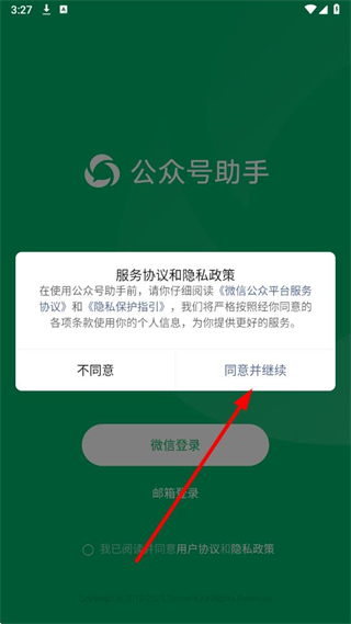 1、在公众号助手的服务协议弹窗中,点击同意并继续按钮,进入登录方式选择页面。