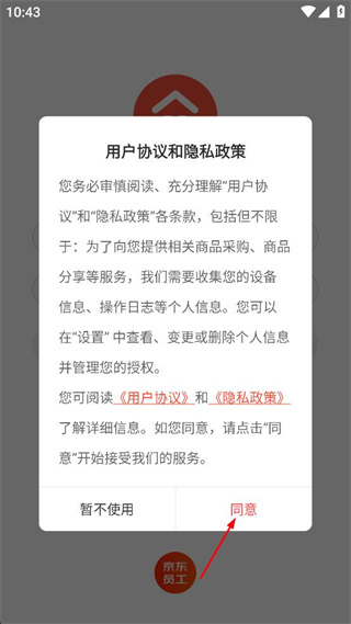 1、打开应用后,阅读弹出的用户协议和隐私政策内容,确认后点击界面中的同意按钮。