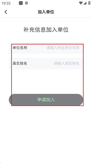 4、在补充信息加入单位页面,填写单位名称、真实姓名,点击申请加入完成提交。