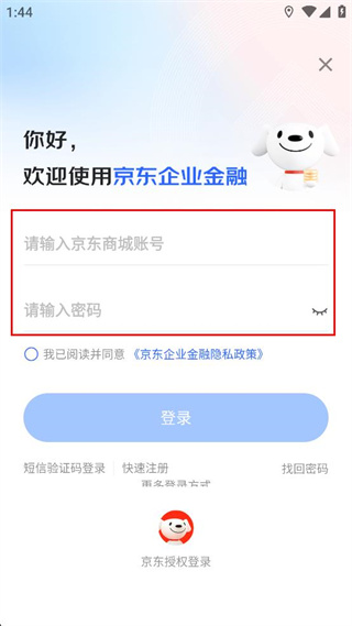 3、进入登录界面后,在对应输入框内填写京东商城账号以及对应的登录密码信息。