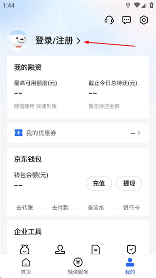 2、在个人页面中,找到登录注册选项,点击该选项进入京东企业金融的登录界面。